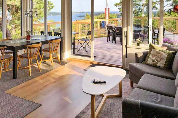 Henrik Lindahl und sein Kollege bauten das Haus genau an der Stelle, an der Henrik als Kind spielte und schwamm. Mit seiner stilvollen Form und der Holzfassade fügt sich das moderne Haus wunderbar in seine natürliche Umgebung ein. Die durchdachte Einrichtung mit exklusiven Materialien und geschmackvollen Möbeln schafft eine moderne, gemütliche Atmosphäre. Das großzügige Raumangebot bietet Platz für viele Personen. So kann auch eine große Familie auf den Sofas im Wohnzimmer entspannen und am Esstisch bequem sitzen. Von der hochmodernen Küche aus hat man nicht nur einen Überblick über die ganze Familie, sondern auch eine unvergleichliche Aussicht aus den Panoramafenstern.