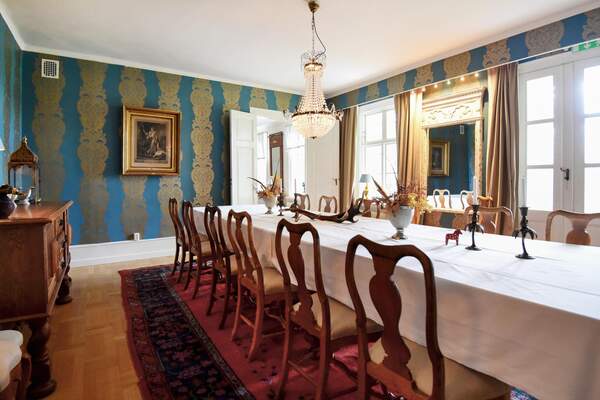 Im Süden von Närke, 40 km südöstlich von Örebro, liegt die Jagdvilla Nain auf dem Landgut Boo, das von den Eheleuten Hamilton betrieben wird. Hier wohnen Sie auf einem einzigartigen Anwesen, umgeben von malerischer Umgebung, Wäldern, Seen und geschichtsträgigen Bauten, die es zu erkunden gilt. Dieses herrschaftliche Haus bietet auf 360 m2 viel Raum und Komfort für Familien. Mit bis zu neun Schlafzimmern, mehreren Wohnzimmern und einer Landhausküche findet hier jeder genügend Platz. Das Haus ist geschmackvoll eingerichtet, mit schönen Antiquitäten, Kristallleuchtern und gemütlichen Sitzecken mit Jagdhörnern, die die Wände schmücken.