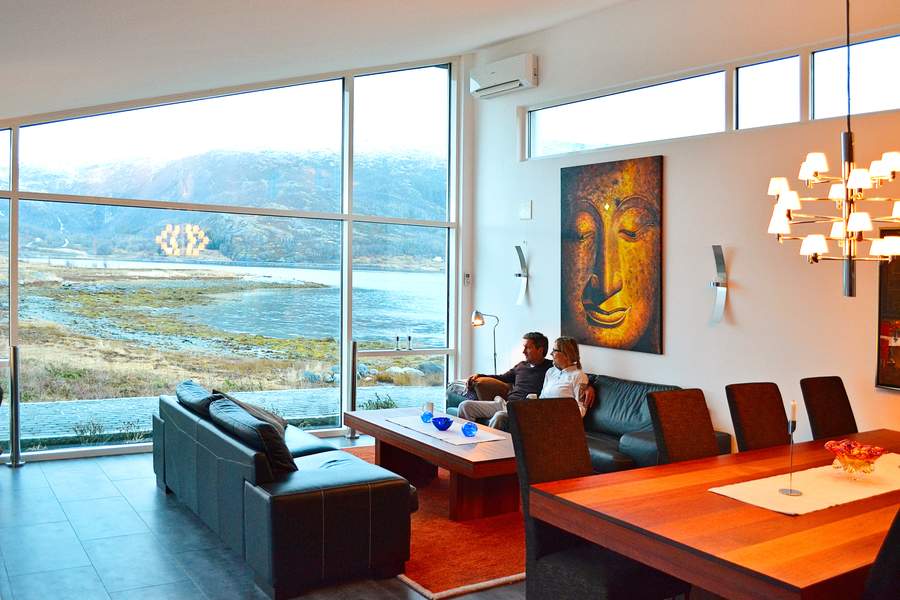 Bei einem Aufenthalt in Dänemark holte sich der Hauseigentümer dieses außergewöhnlichen Ferienhauses zahlreiche Anregungen für den Bau des Hauses. Jetzt zeichnet sich das Haus durch die Verwendung von außergewöhnlichen Materialien wie Beton und Glas aus und es besticht eben dadurch, dass es kein typisches Ferienhaus im Stile des Norwegischen Nordens ist. Er hat das Grundstück gekauft, da es nur 15 Meter vom Meer entfernt ist und in der Nähe einen Liegeplatz für ein Boot hat. Im Laufe der Jahre wurde ein Wintergarten mit Glasdach angebaut, der sowohl das raue Wetter als auch die Nordlichter näher bringt. "Es fühlt sich an, als kämen die Nordlichter in Ihr Ferienhaus, und das ist ein tolles Erlebnis", sagt der Hausbesitzer. Das Haus war einer der acht Finalisten des European Holiday Home Award 2017 für das beste Health @ Wellness Holiday Home.